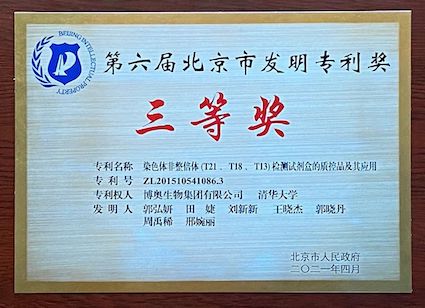 4月20日上午,京津冀促進知識產(chǎn)權運用工作會暨北京市發(fā)明專利獎頒獎大會在京舉行,博奧生物集團聯(lián)合清華大學的“染色體非整倍體(T21、T18、T13)檢測試劑盒的質(zhì)控品及其應用”發(fā)明專利喜獲三等獎,彰顯了博奧生物在無創(chuàng)產(chǎn)前基因檢測技術上的先進優(yōu)勢。