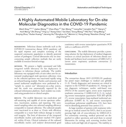 這一抗疫利器的研發(fā)成果以題為"A Highly Automated Mobile Laboratory for On-site Molecular Diagnostics in the COVID-19 Pandemic"的研究論文于2020年4月在國際檢驗(yàn)醫(yī)學(xué)界權(quán)威雜志《臨床化學(xué)》(Clinical Chemistry)重磅發(fā)表,該論文詳細(xì)闡述了“輕騎兵”的性能特點(diǎn)和檢測能力等成果,得到了國內(nèi)外廣泛關(guān)注。該項重量級抗疫攻關(guān)科研成果的發(fā)表,為新冠病毒核酸檢測移動實(shí)驗(yàn)室快速部署醫(yī)療診斷系統(tǒng)提供了一種有發(fā)展前景的解決方案,有助于控制新冠病毒的區(qū)域性傳播。