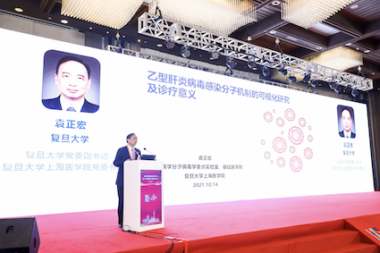 復(fù)旦大學(xué)黨委副書記、復(fù)旦大學(xué)上海醫(yī)學(xué)院黨委書記袁正宏教授作了題為《乙型肝炎病毒感染分子機(jī)制的可視化研究及診療意義》的專題報(bào)告。報(bào)告介紹了研究團(tuán)隊(duì)利用基于 bDNA 的熒光原位雜交結(jié)合免疫熒光技術(shù)及 CRISPR-Tag 活細(xì)胞實(shí)時(shí)熒光失蹤技術(shù),系統(tǒng)性地建立了在體外細(xì)胞和組織系統(tǒng)進(jìn)行原位雜交加熒光、顯色檢測(cè)HBV核酸和蛋白可視化的方法。通過可視化技術(shù),研究團(tuán)隊(duì)在亞細(xì)胞水平直接觀察到HBV病毒組分,揭示了HBV病毒部分關(guān)鍵復(fù)制環(huán)節(jié)的細(xì)節(jié),填補(bǔ)了HBV生活史一些關(guān)鍵環(huán)節(jié)的時(shí)空信息。在組織水平觀察到病毒核酸與蛋白的分布特征,反應(yīng)肝臟內(nèi)HBV病毒的生活特征。課題組開發(fā)的可視化技術(shù)可以用來監(jiān)測(cè)慢乙肝患者抗病毒治療后病毒蛋白質(zhì)和核酸,尤其 cccDNA 的清除情況,有助于臨床醫(yī)生制訂更好的治療方案,并可為指導(dǎo)開發(fā)新藥物提供幫助。