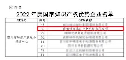 近日,國(guó)家知識(shí)產(chǎn)權(quán)局發(fā)布了“2022年度國(guó)家知識(shí)產(chǎn)權(quán)優(yōu)勢(shì)企業(yè)”評(píng)定結(jié)果公示。經(jīng)企業(yè)測(cè)評(píng)、推薦上報(bào)、省市專家審核確認(rèn)等嚴(yán)格篩選程序,博奧晶典旗下成都博奧晶芯生物科技有限公司(以下簡(jiǎn)稱:博奧晶芯)憑借在知識(shí)產(chǎn)權(quán)創(chuàng)造、運(yùn)用、保護(hù)和管理方面的優(yōu)勢(shì),榮獲“2022年度國(guó)家知識(shí)產(chǎn)權(quán)優(yōu)勢(shì)企業(yè)”稱號(hào)。