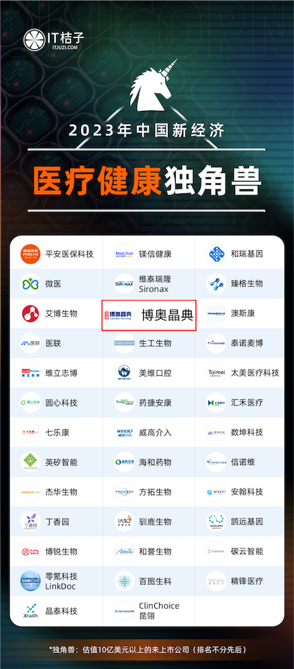 1月18日,新經(jīng)濟(jì)創(chuàng)投數(shù)據(jù)服務(wù)商 IT 桔子正式發(fā)布《2023年中國新經(jīng)濟(jì)獨角獸企業(yè)》系列重磅榜單。博奧晶典憑借在醫(yī)療健康領(lǐng)域的持續(xù)深耕及領(lǐng)先行業(yè)的卓越創(chuàng)新能力,榮登2023年中國新經(jīng)濟(jì)榜單,再獲行業(yè)權(quán)威認(rèn)可。