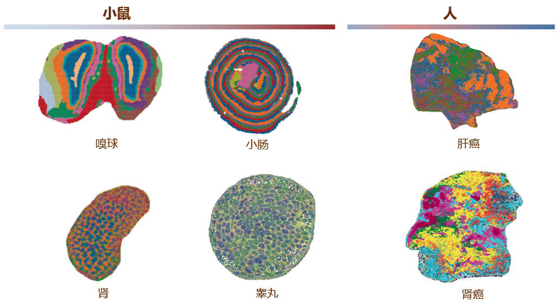 目前對人和小鼠的多種組織,包括嗅球、小腸、腎臟、肝等進(jìn)行空間轉(zhuǎn)錄實驗,繪制各種細(xì)胞類型在組織中的精細(xì)空間分布(圖4)。